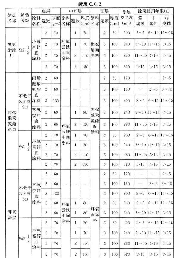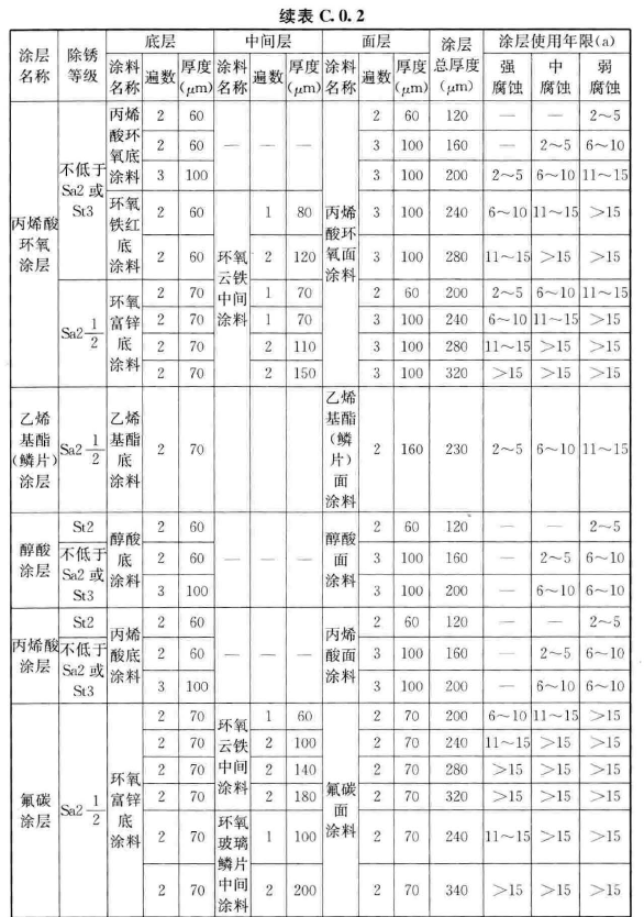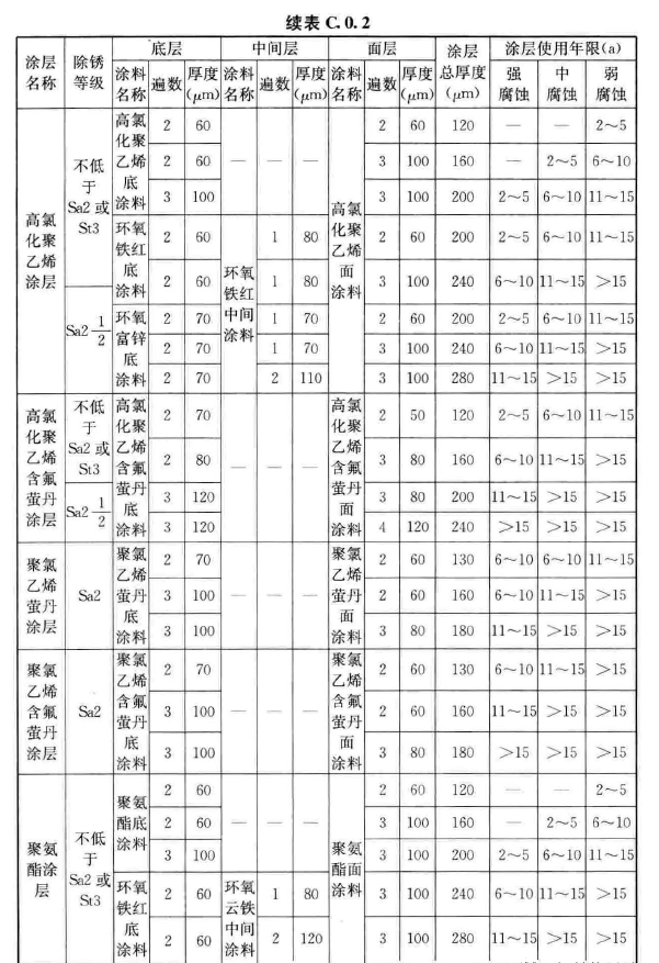 根據(jù)《工業(yè)建筑防腐蝕設(shè)計標(biāo)準(zhǔn)》GB/T 50046-2018第3.3.3條,防護層的設(shè)計使用年限應(yīng)符合下列規(guī)定: